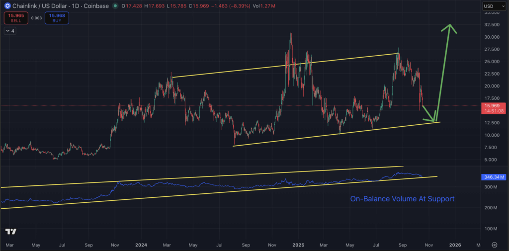LINK’s technical analysis supports this thesis as well. With its on-balance volume (OBV) now at a key support level, there is a strong likelihood of a bounce back. In fact, the Chainlink price is close to forming a bullish divergence with its OBV.